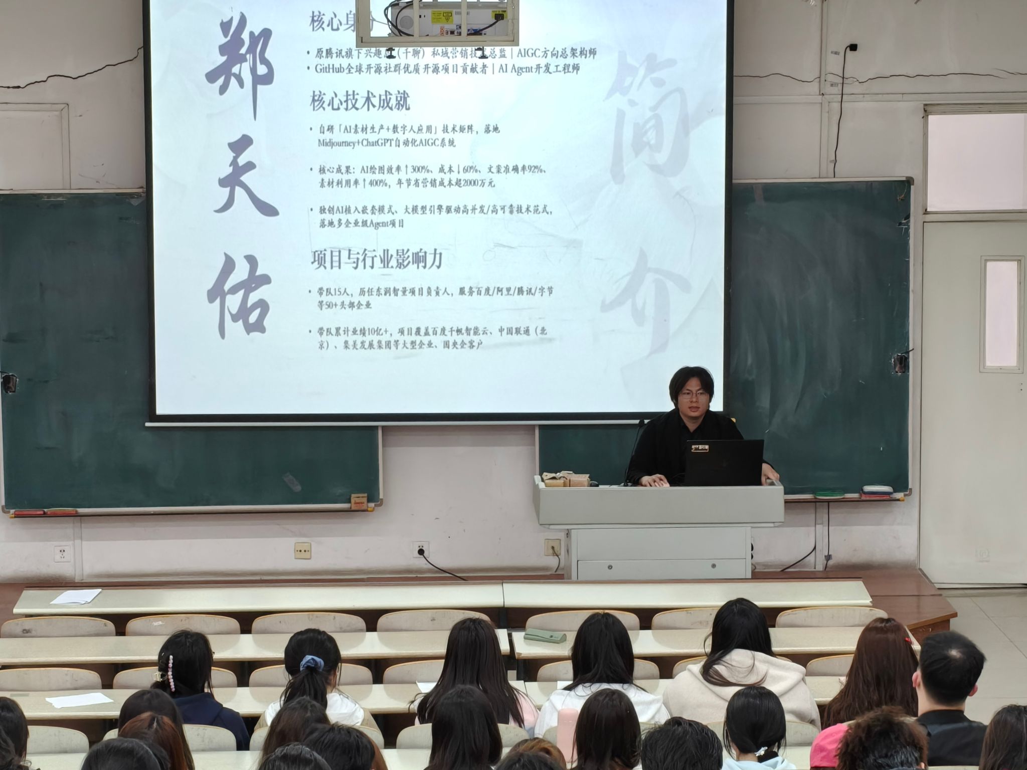 于博学楼AJ109教室成功举办“AI时代的生产力架构”专题讲座。本次讲座特邀原腾讯旗下兴趣岛(千聊)私域营销技术总监、AIGC方向总架构师,GitHub全球开源社群优质开源项目贡献者、AI Agent开发工程师郑天佑主讲,学院师生积极参与。